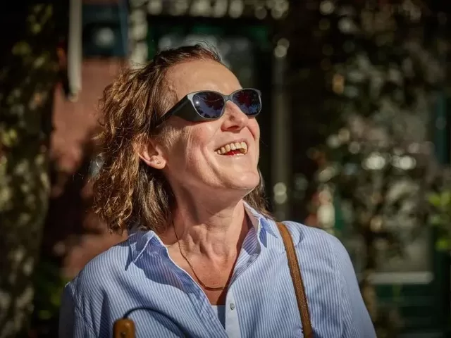 Ondanks haar visuele beperking heeft Erna een actief leven. Ze onderneemt graag dingen en hecht waarde aan momenten van ‘simpel geluk’. Maar wat is ‘simpel geluk’ eigenlijk? Erna: “Toen mijn man nog leefde, was ik een keer met hem in het tuincentrum. Hij beschreef mij heel precies hoe een tuinvogeltje eruit zag: de kleuren, de grootte, het materiaal... Hij schetste uitgebreid het beeld dat hijzelf in één oogopslag kon zien. Hij nam dus de tijd om beeldend te vertellen, zodat ik precies wist hoe het vogeltje eruit zag, ook al kon ik niets zien. Toen kwam er iemand naar ons toe die zei dat ze het zo mooi vond dat wij zo met elkaar bezig waren over een vogeltje. Dat soort momenten zijn voor mij simpel geluk!”