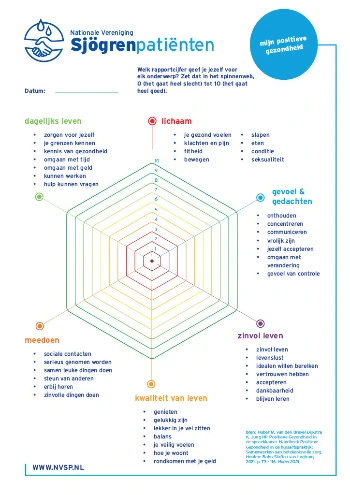 Het spinnenweb van positieve gezondheid helpt je om een helder beeld te krijgen van jouw welzijn. Hoewel het misschien ingewikkeld klinkt, is het eigenlijk een eenvoudige en effectieve manier om te zien hoe je je voelt en waar je eventueel verbeteringen wilt aanbrengen. Je hebt Sjögren, maar dat betekent niet dat je leven volledig door de ziekte wordt bepaald. Dit spinnenweb laat je juist zien wat wél goed gaat, wat minder goed gaat en waar je kracht ligt.